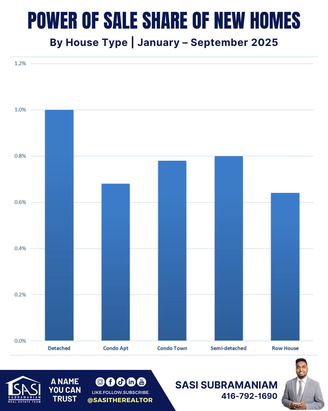 Detached houses are driving this trend. Roughly 1% of new detached listings this year have been Power of Sale, compared to 0.66% for condos. Detached owners often carry larger mortgages, many of which were taken out during the low-interest pandemic boom. Now, as those loans reset at higher rates, some owners are finding it difficult to keep pace.
