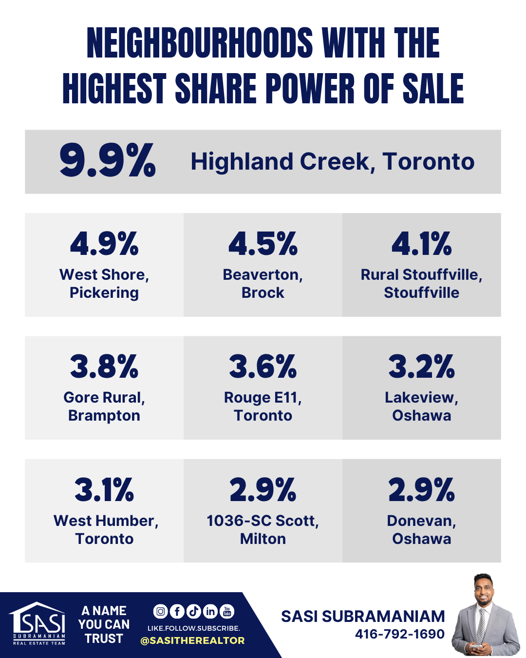 At the neighbourhood level, a few areas stand out. Four GTA neighbourhoods have Power of Sale shares above 4%, with Highland Creek in Toronto topping the list at nearly 10%.