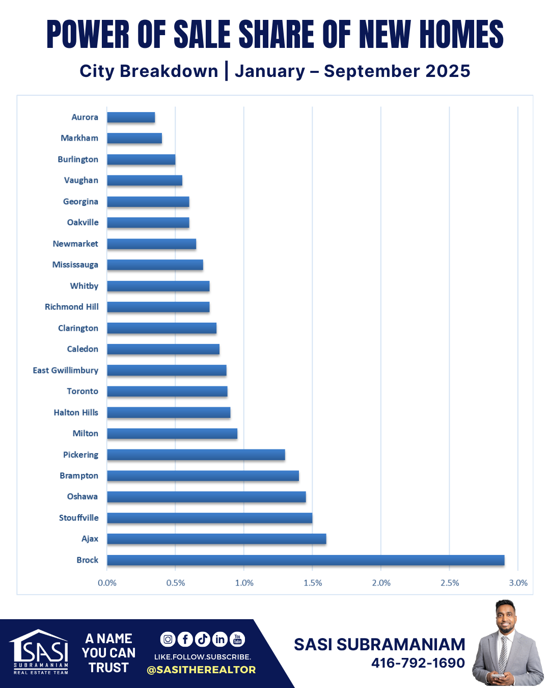 Meanwhile, established suburbs such as Aurora, Markham, and Vaughan are showing much lower rates of POS listings. This highlights how uneven the stress is across the GTA — some markets are under far more pressure than others.